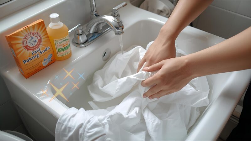 洗面器に40度前後のお湯を張り、大さじ2杯ほどの重曹を入れてよく溶かし、衣類を20〜30分つけ置きしましょう。